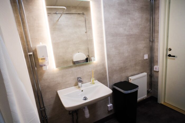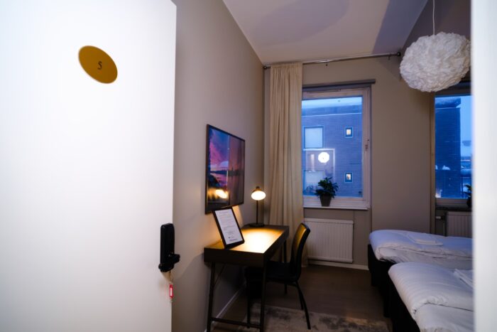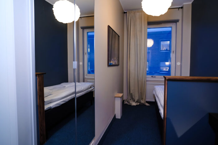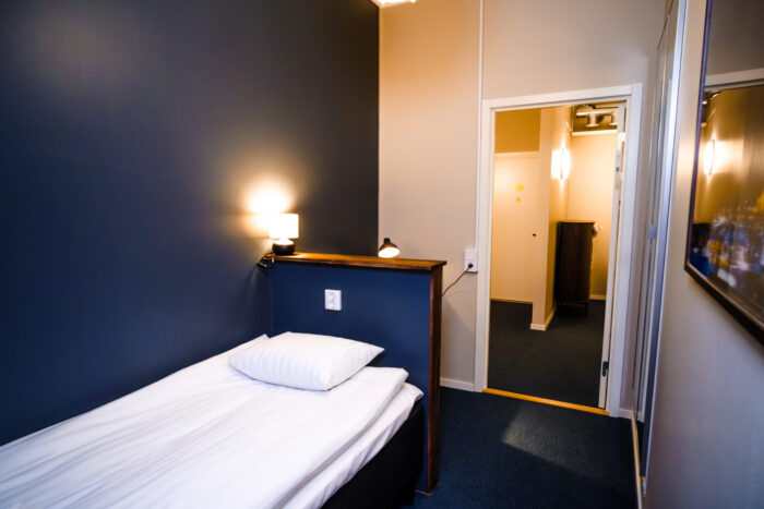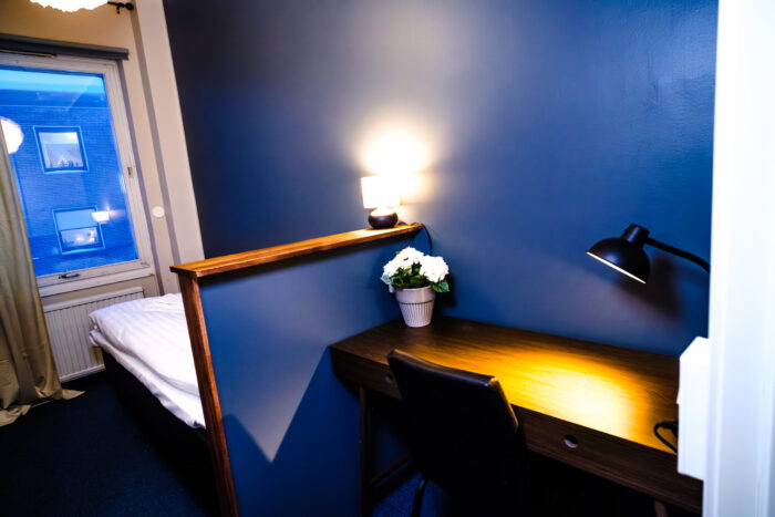 Our single rooms without windows offer the same high standard as our other room types but do not have windows with natural daylight. The room is approximately 8 sqm and is equipped with a 90 cm hotel bed, a desk with chair, a wardrobe, and a mirror. Here you enjoy a private and functional space while also having access to the property’s shared kitchen, living room, bathrooms, and social areas.