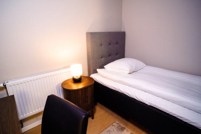 Our single rooms are newly renovated to a high standard. The rooms are approximately 10–12 sqm and are equipped with a 90 cm hotel bed, a desk with chair, a wardrobe, and a mirror. Here you enjoy a private and functional space while also having access to the property’s shared kitchen, living room, bathrooms, and social areas.